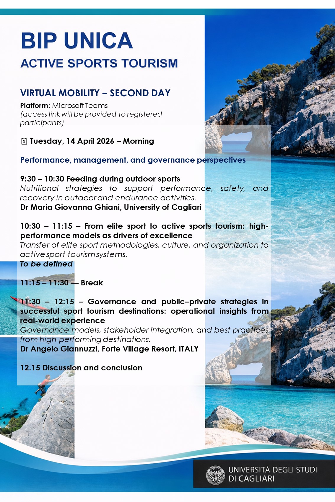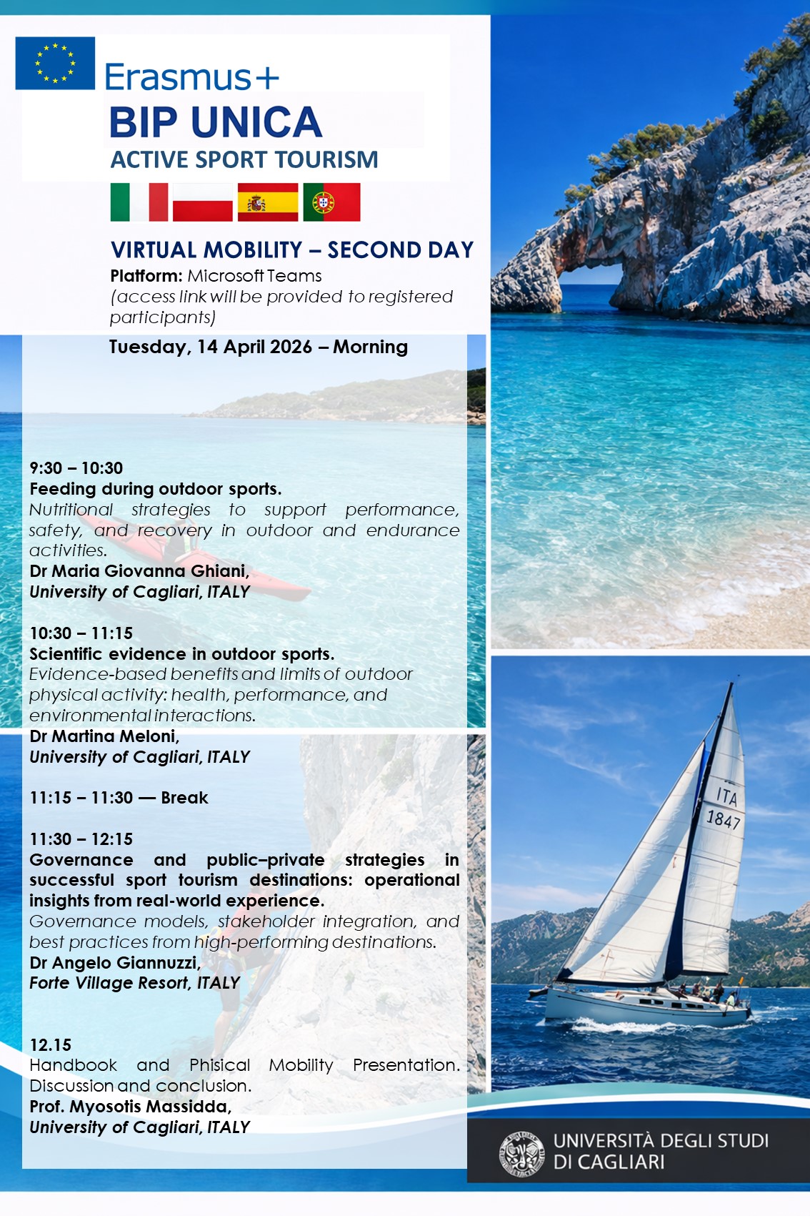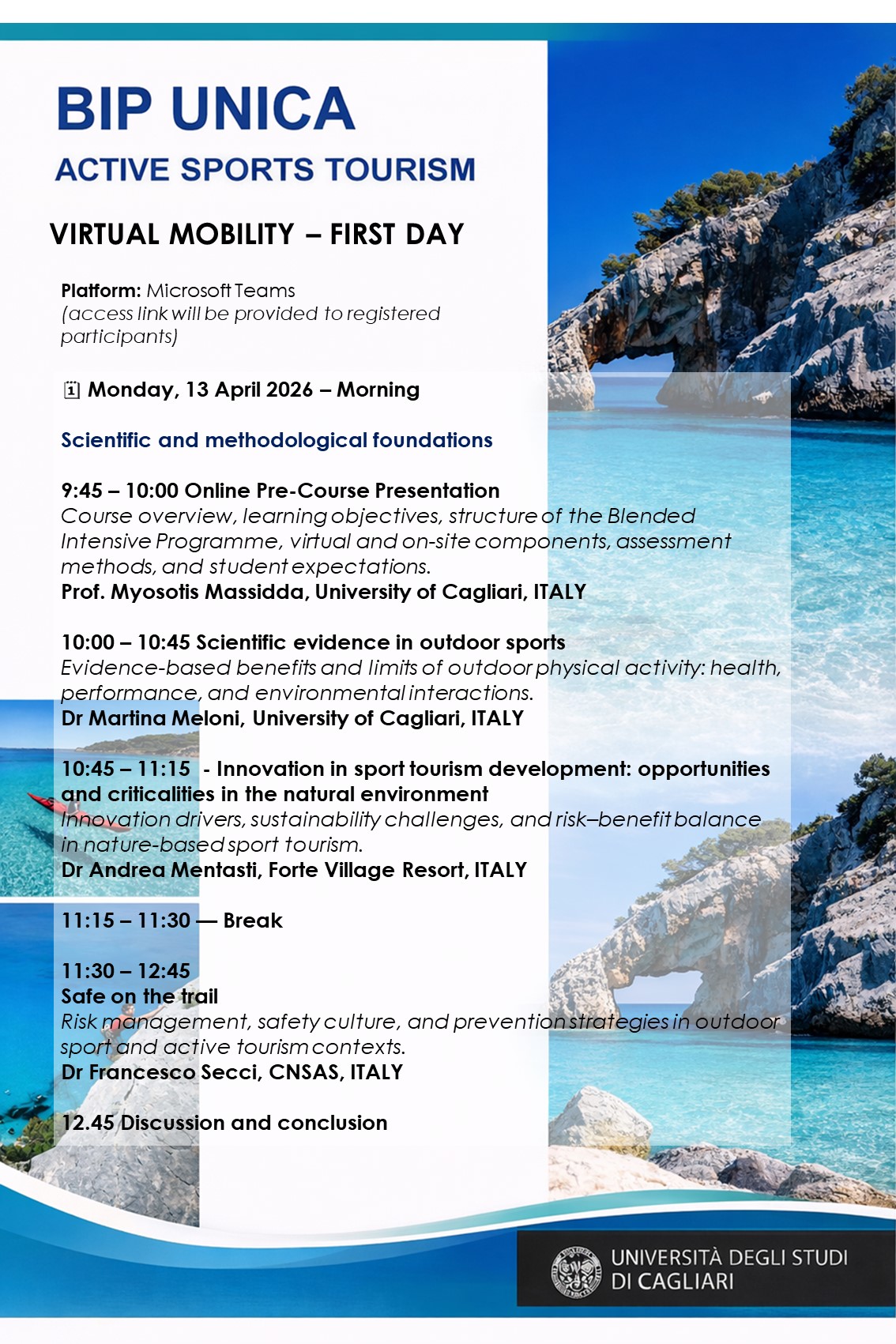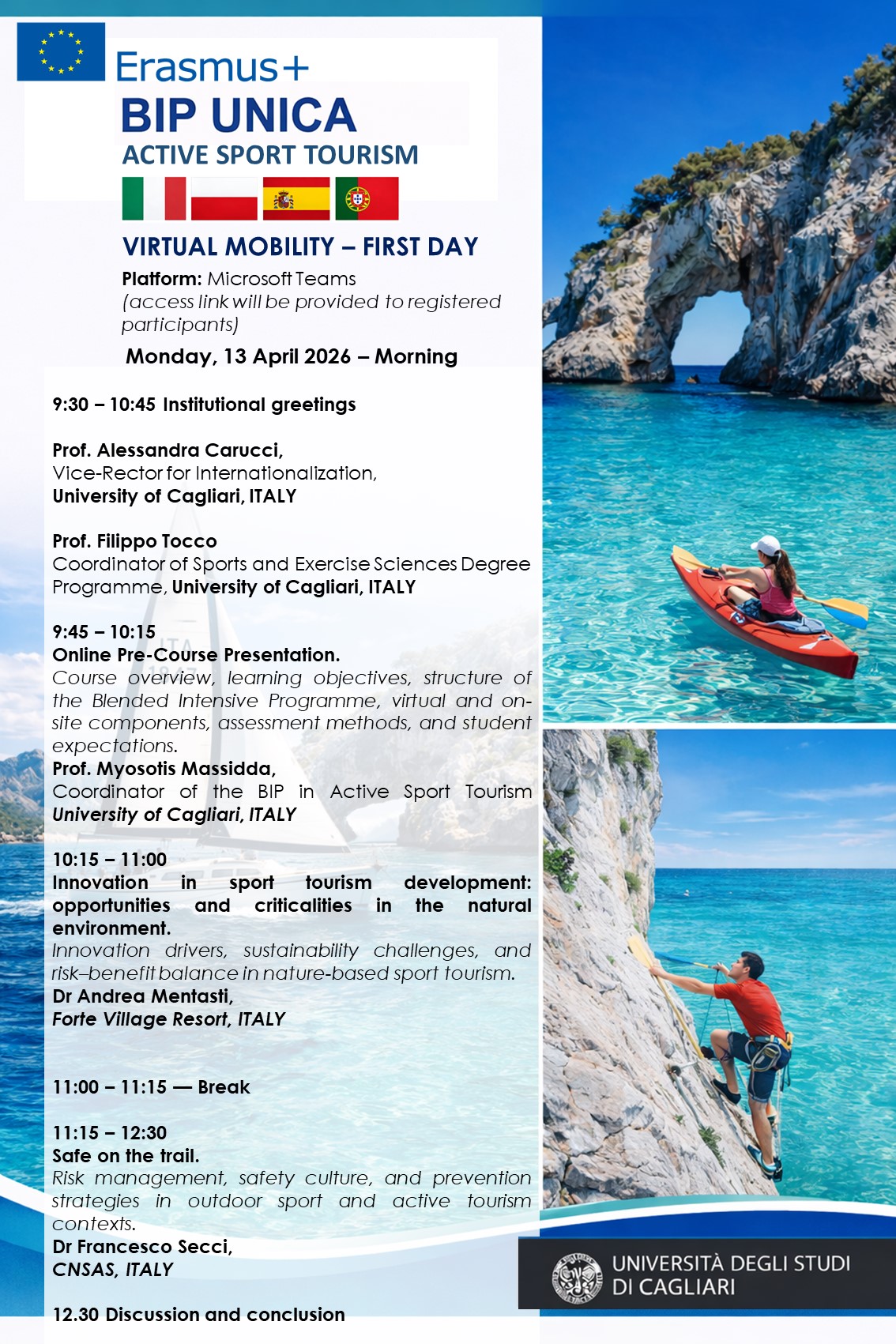 As part of this vision, the Unica Sport Science International Conference (USSIC) highlights selected international educational initiatives that enrich the scientific, cultural, and experiential context of the Conference. The Erasmus+ Blended Intensive Programme (BIP) “Active Sport Tourism”, hosted by the University of Cagliari, is a Pre-USSIC Educational Event dedicated to active sport tourism, integrating sport science, safety, sustainability, and experiential outdoor activities in Sardinia.